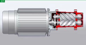 外部齒輪是常用的使反向轉動的轉子同步裝置。由于轉子之間不可能接觸到對方,也不可能接觸到殼體,所以壓縮室內不要求潤滑。因此,壓縮空氣無油。轉子與殼體都要進行的制造,以使從壓縮處向進氣道的泄漏實現小。內置壓縮比受限于進氣道與排氣道的壓力差。這就是為什么無油螺桿空壓機普遍都分級壓縮且內置冷卻、能達到較高壓力的原因。