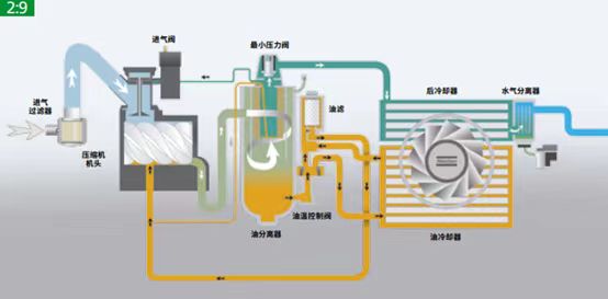 在液體式螺桿空壓機中,液體進入壓縮室,也經常會進入空壓機軸承。其功能是冷卻并潤滑空壓機的運動部件、冷卻在內部被壓縮的空氣,并減少返回進氣道的泄漏。